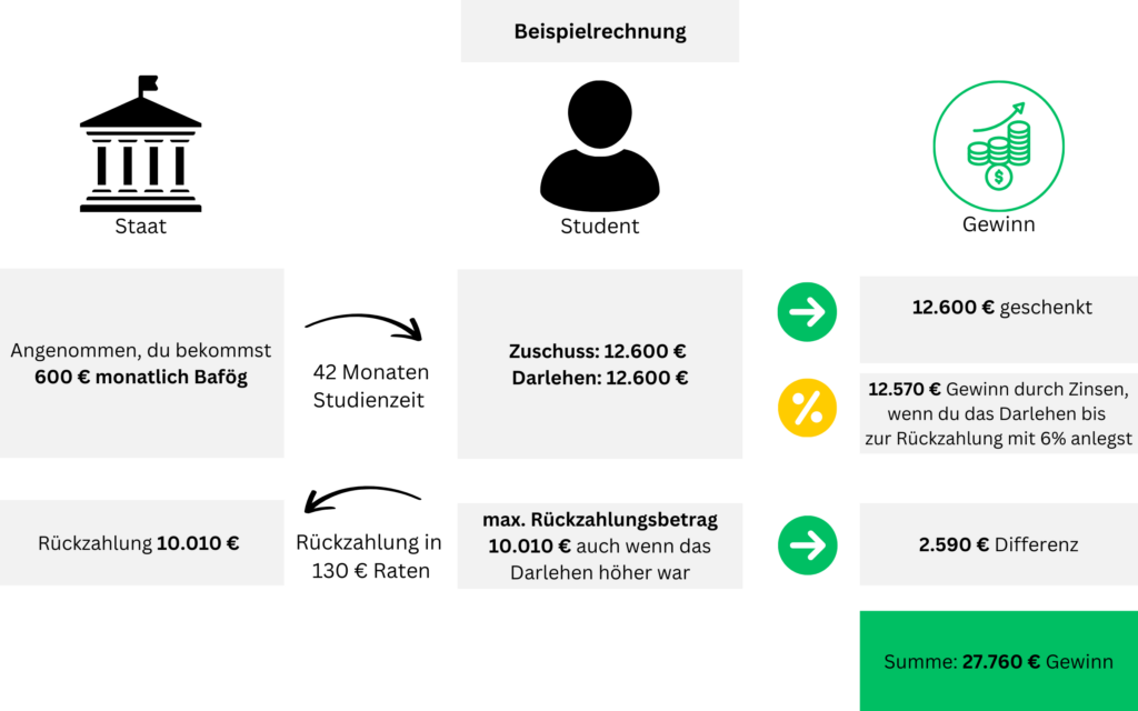 Tipp: Wenn du Angst vor der Rückzahlung hast, kannst du das Geld, das du später zurückzahlen musst, während des Studiums auf ein separates Tagesgeldkonto legen oder es in rentablere Investmentmöglichkeiten investieren um dein Geld bis zur Rückzahlung für dich arbeiten zu lassen.